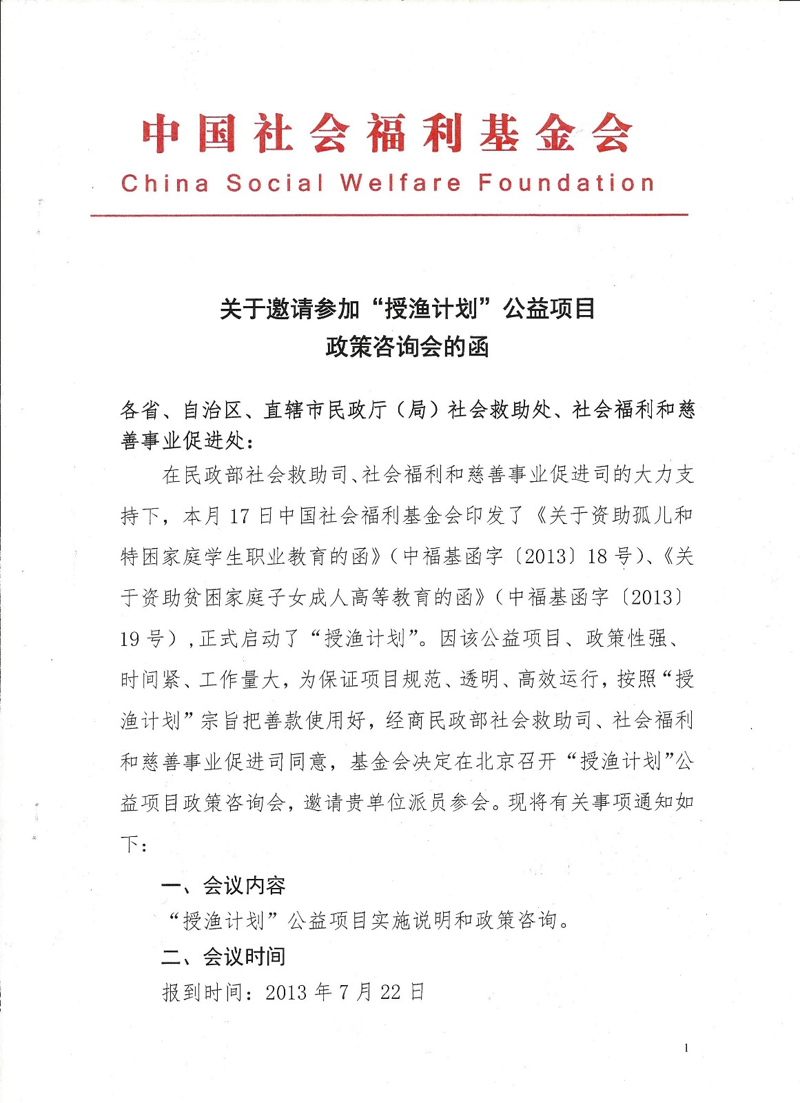 关于邀请参加“授渔计划”政策咨询会议的邀请函