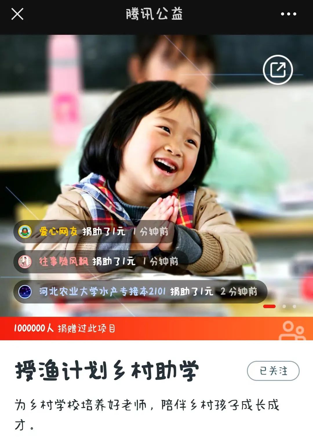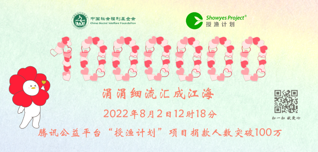 涓涓爱心细流汇成爱的江海,截至2022年8月2日12时18分,共有100万人次通过腾讯公益平台向“授渔计划”捐赠善款。
