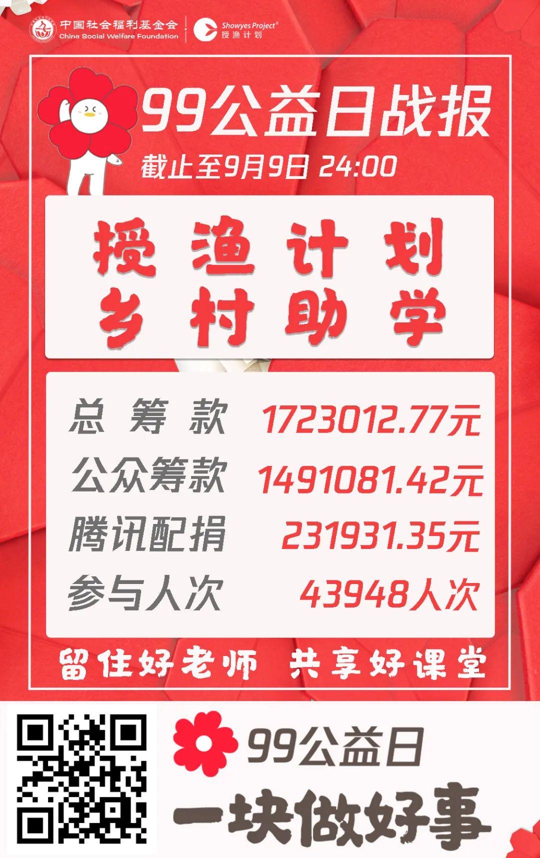 9月参与腾讯“99公益日”,获得43948人次的捐款,筹得善款1723012.77 元。