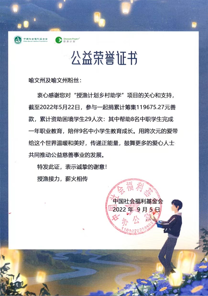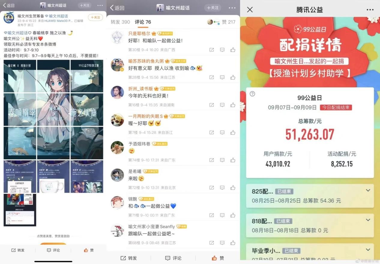 今年腾讯99公益日期间喻文州公益和@喻文州生贺筹备,发起《春喻桃李,施之以渔》的公益活动,和粉丝们共同为爱发声,共筹集善款51263元,为更多有困难的孩子家庭带来了希望。感恩你们在网络的另一端给予这个世界温暖和美好。