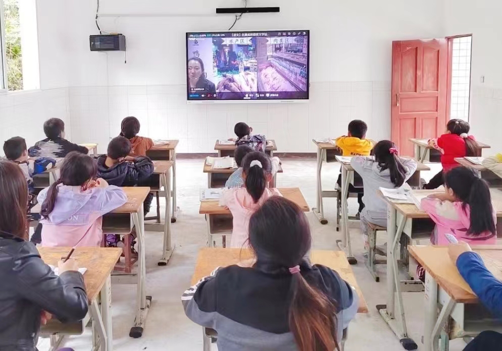 “Baby monkey banana-na-nas, baby monkey banana-na-nas, Bananas!”欢快的音乐声在授渔计划的授课教室响起,但这节课并不是音乐课,而是由北京市石景山区实验小学的詹娇老师为乡村的孩子们带来的一堂英语示范课。原本枯燥的英语课程变得生动有趣,同学们在快乐的氛围中完成这堂课的内容。