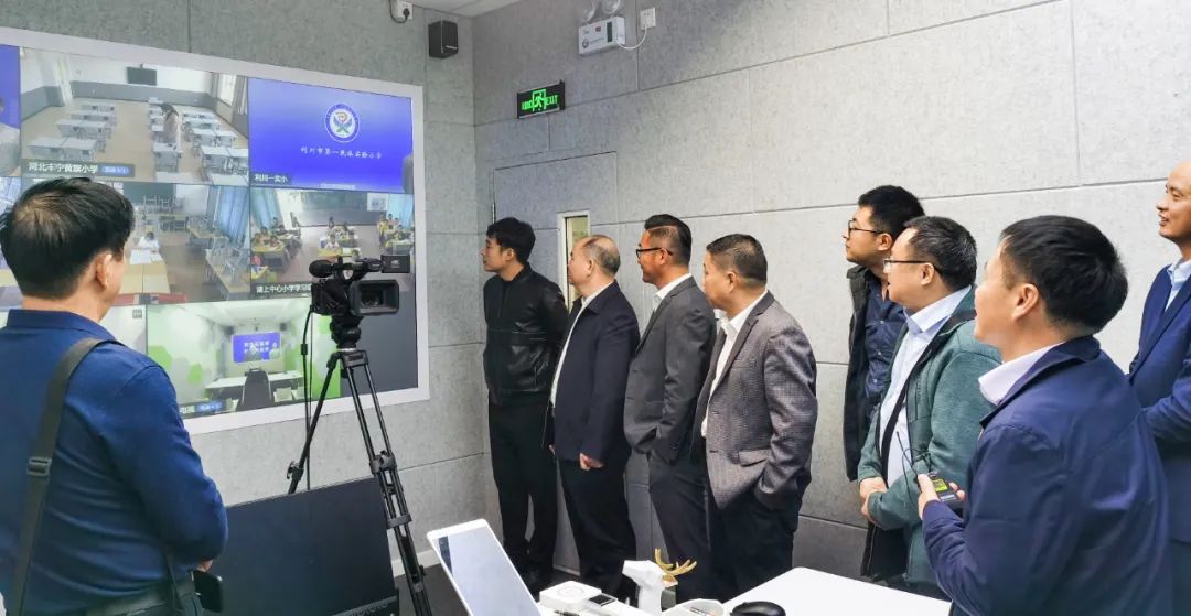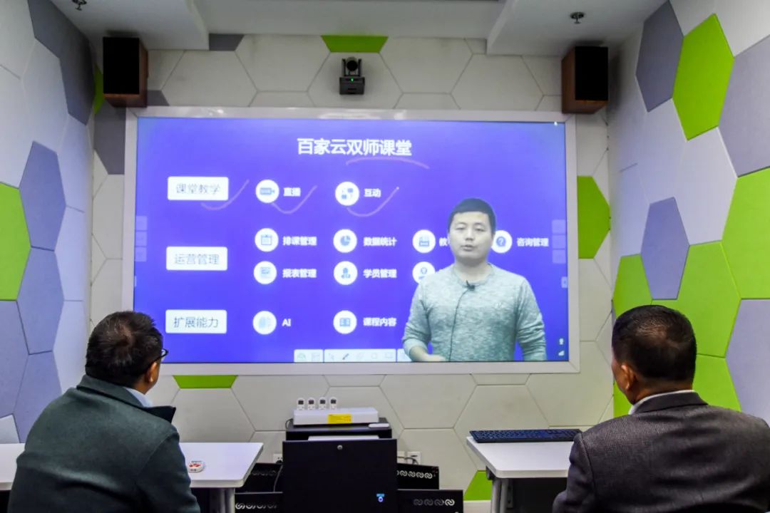 下午,大家来到“双师课堂”项目技术支持单位北京百家双师科技有限公司实地体验和详细了解“双师课堂”技术使用情况。在模拟“双师课堂”授课端、听课端教室完整地体验了主讲老师通过大屏幕远程直播互动授课,辅导老师在课堂内负责课堂管理、答疑,学生实时互动学习的“双师”教学模式。